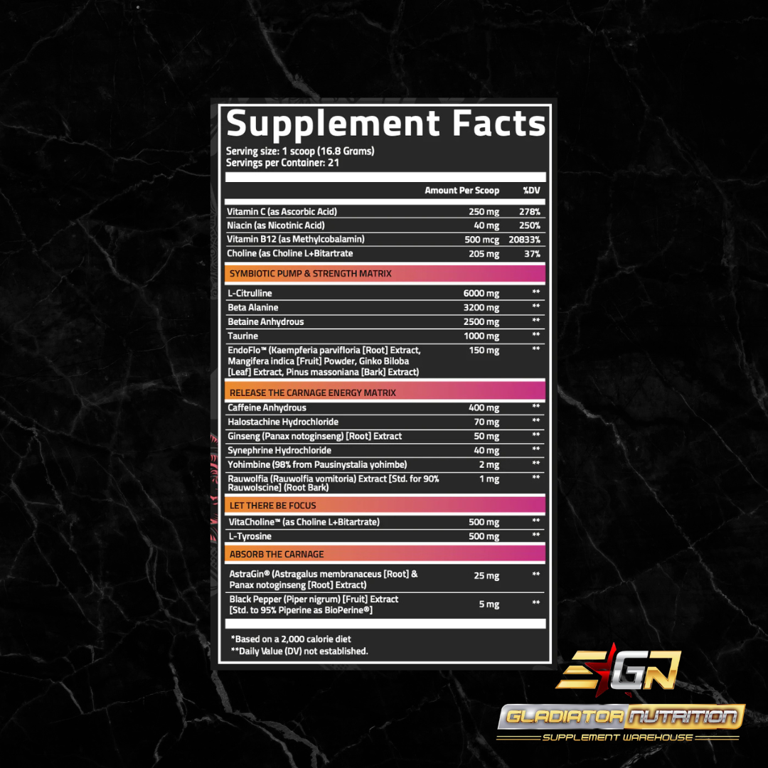 Engineered for serious athletes and stim-hardened lifters, this formula delivers a brutal edge where others fall flat. Powered by clinically dosed, patented ingredients, and an unapologetically high-stim profile, CARNAGE hits with force — igniting your energy, sharpening your focus, and unleashing skin-splitting pumps that keep coming long after your last set.